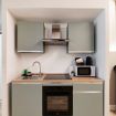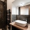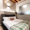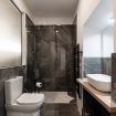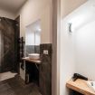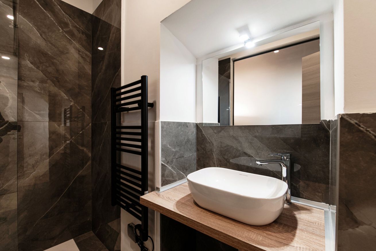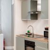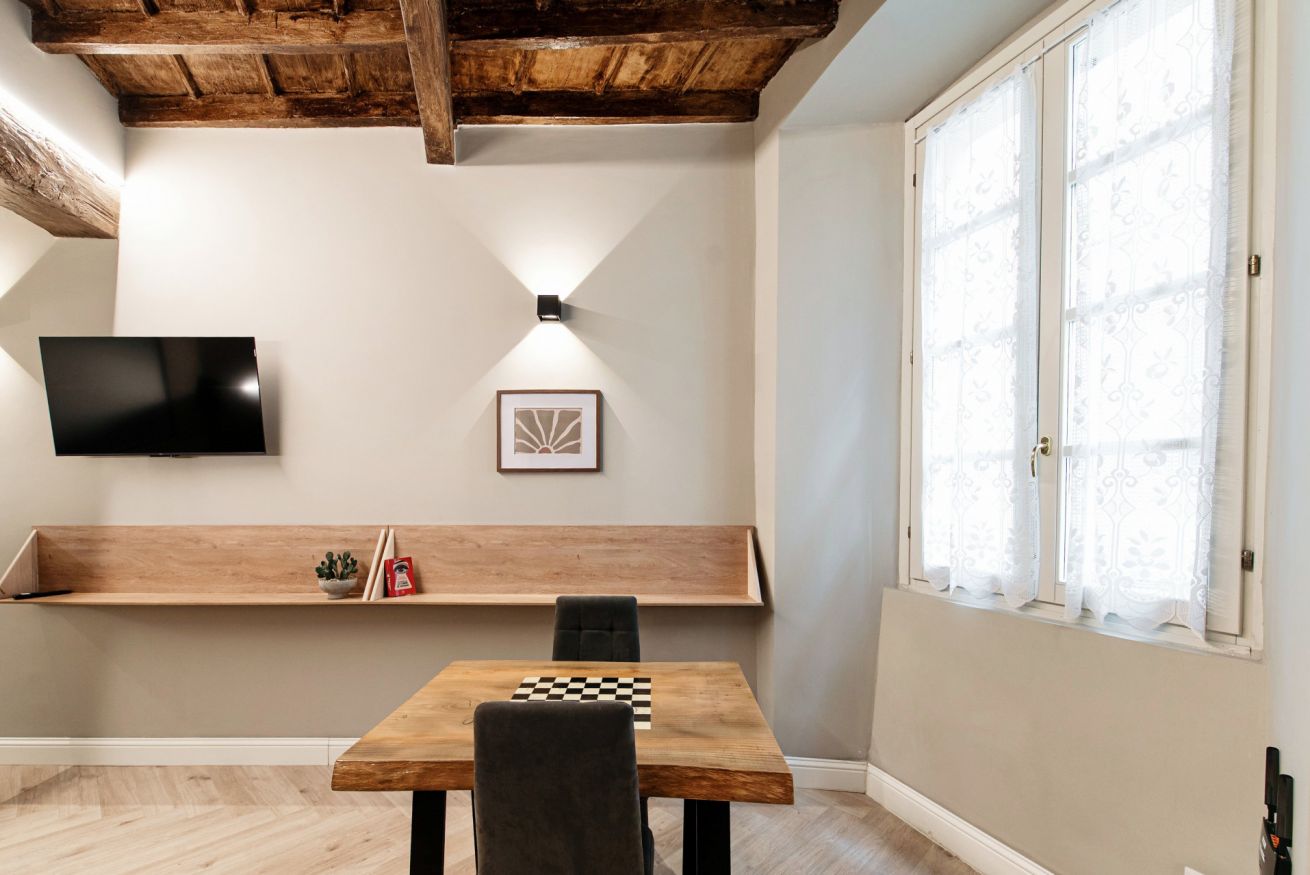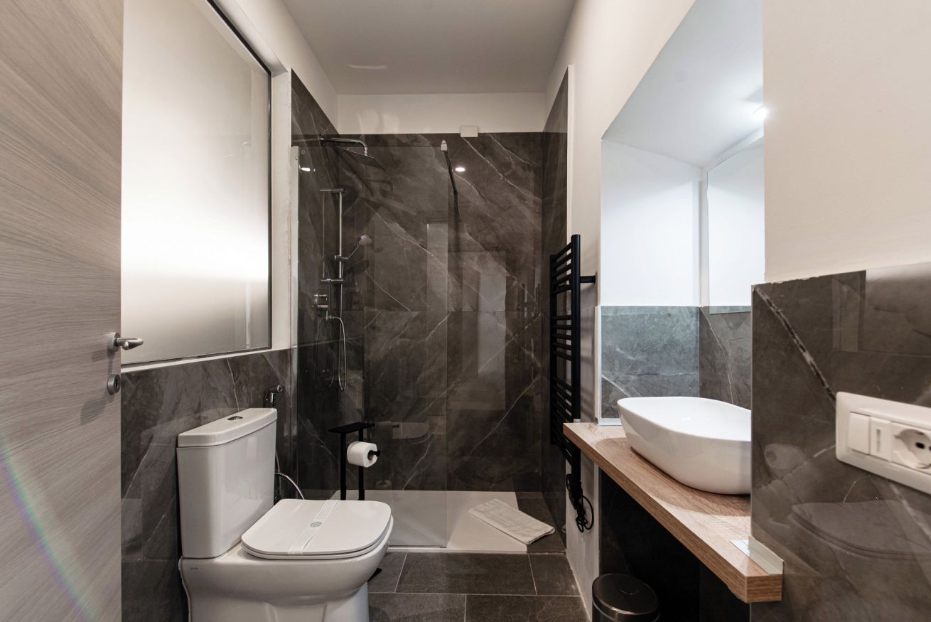 The spacious open-plan layout harmoniously combines the living area—featuring a modern, fully equipped kitchen that allows you to enjoy the city without giving up the comforts of home—with the sleeping area, enhanced by a double bed with a soft velvet headboard. Warm-toned finishes, herringbone parquet flooring, and contemporary furnishings create a refined yet welcoming atmosphere, ideal for a comfortable stay just steps away from the city’s main attractions. Completing the apartment is an elegant bathroom with stone-effect tiles and a large walk-in shower.