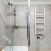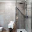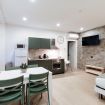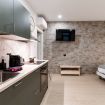 The spacious open-plan layout is thoughtfully arranged to offer a well-organized environment where the living and sleeping areas blend harmoniously. The modern kitchen, in elegant sage green tones, is fully equipped for home-style cooking, while the dining table is ideal both for working and enjoying meals with company. Nearby, the comfortable double bed creates the perfect corner for rest, turning the apartment into a peaceful retreat to recharge after a day exploring the historic centre and the lakeside. The light-toned stoneware flooring and the stone-effect feature wall, shaded between grey and beige, add warmth and comfort to the space while enhancing its refined and minimalist design. The bathroom features a shower, ensuring maximum convenience.