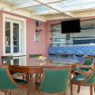 The living area features a large, elegantly furnished living room with comfortable sofas, a fireplace and a bookcase, creating a welcoming environment for moments of rest or conviviality. Adjacent to the living room is a bright covered veranda, equipped with a barbecue and wood-burning oven, ideal for lunches and dinners with friends in any season. The fully equipped kitchen, with attention to every detail, offers modern appliances and a large dining area with a refined wooden table.