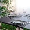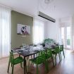 On the right the dining room, where nature is the protagonist with a wall entirely green: the table and its green and black chairs can accommodate up to 10 people with a view overlooking the lake of Lugano.