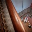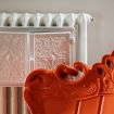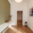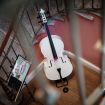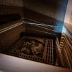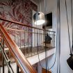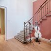 Continuing to the back entrance, there is a second foyer with a staircase, access to the basement and second floor. it looks like a stage: the cello in the center is illuminated by the beautiful cascading chandelier, reminiscent of spotlights. The decorative climbers seem to climb the wall covered by the red tropical patterns.