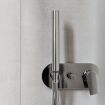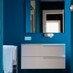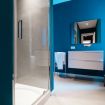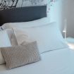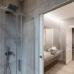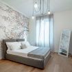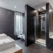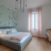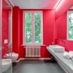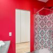 On the left is the Ciliegio room, overlooking the lake and the open view to Melide in shades of pink and gray, with its private closet that allows access to the whimsical red bathroom with the particular tapestry in the walls of the shower.