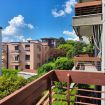 The spacious living area serves as both a lounge—equipped with a TV and a convenient desk corner, perfect for working or studying in peace—and a sleeping area, featuring a comfortable double bed. The room opens directly onto a covered balcony furnished with a small table for two, offering a splendid view of the city and surrounding mountains, with glimpses of the lake in the distance. The kitchenette, located in a separate room, is fully equipped for cooking and includes a table with two chairs—ideal for a quick breakfast or a snack. The bathroom features a comfortable shower for added convenience.